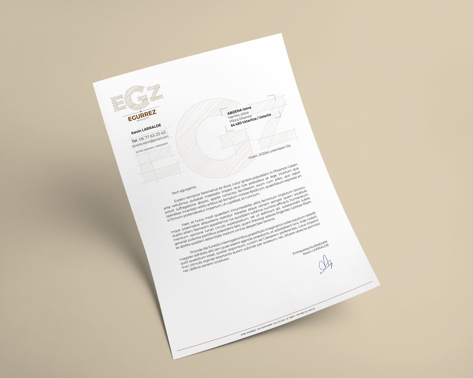 Travail mené avec Kevin Larralde, qui travaille dans le domaine de la menuiserie au sein de l’entreprise EGURREZ d’Irisarri. Création d’une identité graphique et développement de ses différentes déclinaisons.